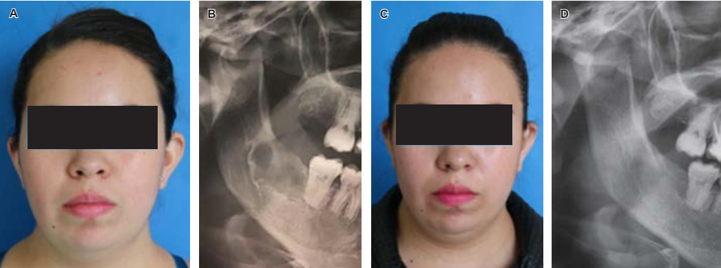 Figura 4 A) Fotografía frontal previa a la enucleación y curetaje de la lesión. B) Ortopantomografía previa a la enucleación y curetaje de la lesión. C) Fotografía frontal un año después de la enucleación y curetaje de la lesión. D) Ortopantomografía un año después de la enucleación y curetaje de la lesión.