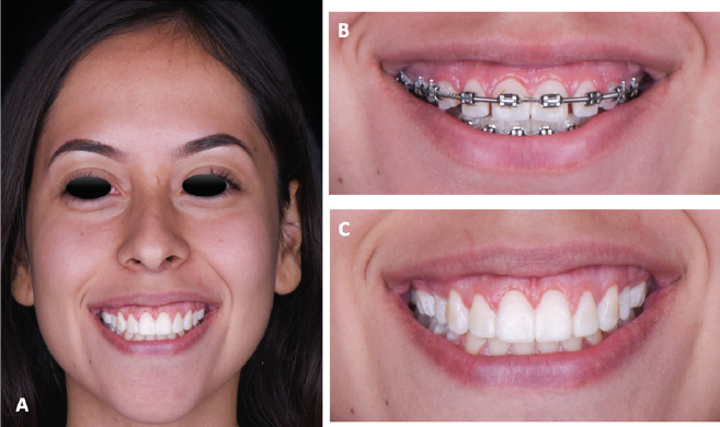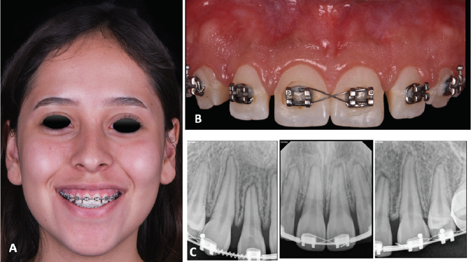 Figura 1 Fotografías y radiografías iniciales. A. Fotografía facial de sonrisa. B. Fotografía intraoral con aparatología de ortodoncia, donde se observan espacios entre los dientes. C. Radiografías dentoalveolares donde se observa continuidad de la lámina dura.