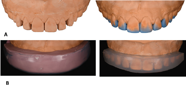 Figura 2 Elaboración de la guía de silicón. A. Modelo y encerado diagnóstico. B. Proceso de confección de guía de silicona.