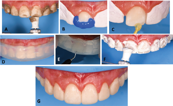 Figura 3 Proceso de inyección de resinas fluidas. A. Acondicionamiento de las superficies dentales. B. Aplicación de ácido grabador. C. Aplicación de adhesivo. D. Matriz de silicona. E. Inyección de resina fluida. F. Pulido de las restauraciones. G. Restauraciones finales.