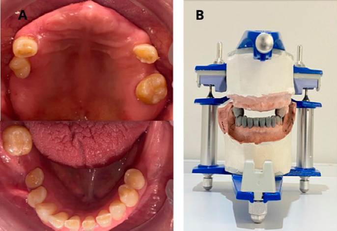 La paciente presentaba edentulismo parcial en ambas arcadas, aunado a una disminución de la dimensión vertical. Se usó la clasificación de Kennedy, obteniendo en el maxilar, clase I, modificación 3 y en la mandíbula, clase II, modificación 1 (Figura 1. A). Por lo tanto, se efectuó un análisis de aumento de dimensión vertical oclusal y en reposo de +4 mm con bases y rodillos superior e inferior, para, posteriormente, montar los modelos de yeso tipo IV en articulador semiajustable (Axiomath® Articulador dental, Vamasa Health Innovation, Monterrey, México) y hacer un encerado de diagnóstico en los dientes 14, 15, 24, 34, 35, 44, 45 y de 31 a 43 (Figura 1. B), en donde se evaluó el plano oclusal y plano incisal. Se propuso el siguiente plan de tratamiento: coronas de zirconia monolítica en premolares, carillas de resina inyectada en anteriores mandibulares y prótesis parcial de acrílico superior e inferior.