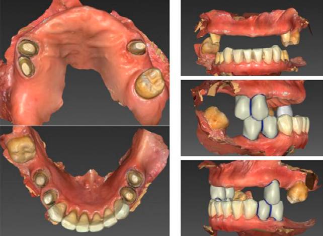 Tan pronto la paciente aceptó el plan de tratamiento, se llevó a cabo la rehabilitación completa por medio de cuatro fases. En la primera fase, se realizó la preparación para coronas de zirconia monolítica en premolares, basándonos en los principios de tallado de Shillingburg, elaborando una línea de terminación chamfer hombro redondeado junto con el apoyo de llaves de tallado. Así mismo, se reconstruyeron los muñones dentales con resina fluida (Brillianttm Flow, Coltène/Whaledent AG, Altstätten, Switzerland) y compuesta color A2 (Brillianttm NG, Coltène/Whaledent AG, Altstätten, Switzerland). Una vez listas las preparaciones dentales, se procedió a escanearlas utilizando el escáner (Primescan, Dentsply Sirona Inc., Charlotte, USA), escaneando ambas arcadas con el protocolo de escaneo del fabricante. Para la toma de registro de mordida, se retiraron provisionales del lado derecho dejando provisionales del lado izquierdo como referencia de dimensión vertical y se realizó lo mismo para el lado opuesto. El software hizo el empate de las imágenes escaneadas (Figura 2), dejando la dimensión vertical planeada para efectuar las restauraciones posteriores. Al ser un procedimiento completamente digital, evitamos utilizar un articulador semiajustable, aumentando la precisión en el tamaño de las coronas a colocar. Se seleccionó el color A2 del colorímetro (Vita classical A1-D4® shade guide, Vita Zahnfabrik, Bad Säckingen, Germany) y después, se envió al laboratorio digital de la misma clínica de la universidad para su elaboración. A través de un diseño digital con software InLab CAM (Dentsply Sirona Inc., Charlotte, USA), se analizó la oclusión, contactos interproximales, preparaciones y líneas de terminación. Terminado el diseño, se envió a un equipo de fresado (inLab MC X5, Dentsply Sirona Inc., Charlotte, USA) para la elaboración de las coronas, para después ser sinterizadas en el horno (inFire HTC speed, Dentsply Sirona Inc., Charlotte, USA), posteriormente pasaron al glaseado y pigmentación en horno convencional para cerámicas dentales y finalmente el arenado a 30 Bar y óxido de aluminio de 30-50 Micras. Enseguida, se elaboraron los provisionales con acrílico rápido, que se revisaron con papel articular, logrando una oclusión estable y balanceada. En esta fase, se llevó a cabo el periodo de adaptación con los provisionales de acrílico.
