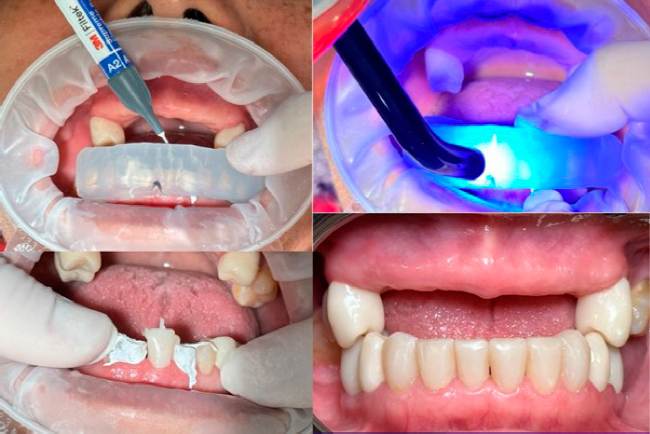 En la segunda fase, se efectuó la confección de carillas de resina inyectada, mediante una llave de silicona que se elaboró el día anterior a la cita, con silicona ligera (Elite Transparent, Zhermack SpA, Badia Polesine, Italy), con la cual se duplicó el encerado. A la llave, se le realizaron orificios por la parte incisal con una fresa de bola número dos, para lograr la entrada y salida de la resina color A2 (3Mtm FiltekTM Supreme Flowable Restorative, 3M, Saint Paul, USA), desde el lado cervical hasta el incisal de la punta, permitiendo la distribución total del material. El procedimiento se ejecutó individualmente en cada diente, aislando con cinta teflón los dientes adyacentes y acondicionando para el proceso de adhesión de cada diente a tratar. En cuanto al contorneado y pulido, se utilizaron lijas interproximales y gomas para pulir, resinas (Tdv Dental Ltda., Pomerode, Brazil), discos (3MTM Sof-LexTM Contouring and Polishing Discs Kit, 3MTM Espe Deutschland GmbH, Germany) y pasta pulidora (UltradentTM Diamond Polish Mint, Ultradent Products Inc., South Jordan, USA) (Figura 3).
