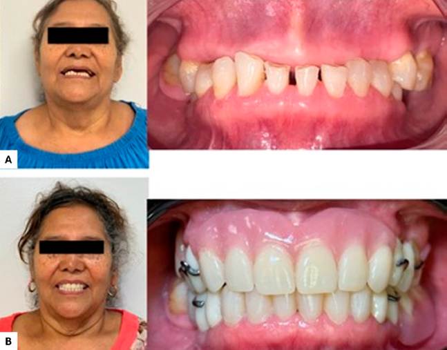 En la cuarta fase, se llevó a cabo el tratamiento de la prótesis parcial de acrílico, tanto superior como inferior. Con cucharilla individual, se hicieron ambos rectificados de bordes con masilla de silicona por adición y toma de impresión funcional con silicona por adición ligera (Coltène/Whaledent AG, Altstätten, Switzerland), para posteriormente, obtener los modelos de trabajo en yeso tipo III. Sobre estos, se realizaron las bases y rodillos para la prueba de orientación de los planos oclusales y registro de la oclusión. Se le pidió a la paciente que mordiera, marcando en zona anteromaxilar, línea media, línea de caninos y de sonrisa. Se montaron los modelos de trabajo junto con las bases y rodillos en articulador de bisagra, para mandar al laboratorio a la elaboración del enfilado, tomando como referencia el color A2 del colorímetro Vita classical A1-D4®. Se hizo la prueba de enfilado, en la cual la paciente se mostró satisfecha con el color, oclusión y morfología, por lo tanto, se mandó al laboratorio para acrilar las prótesis para su realización. A la paciente se le entregaron sus prótesis parciales de acrílico superior e inferior (Figura 4. A). Se probaron ambas para asegurar que asentaran adecuadamente. Sin embargo, se observaron zonas retentivas, las cuales se rebajaron con pieza de baja velocidad y fresón metálico; y se revisó la oclusión. A la paciente se le indicaron instrucciones de limpieza y cuidado de las prótesis. Finalmente se llevó a cabo una fase de control, en diferentes periodos, a las 24 horas, a la semana y al mes, y clínicamente no se observó ninguna alteración en mucosas, tejidos de soporte o dientes (Figura 4. B).