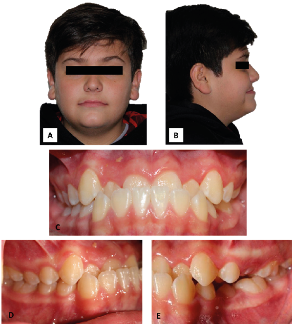 Figura 1 Imágenes iniciales. A. Fotografía extraoral frontal. B. Fotografía extraoral lateral. C. Fotografía intraoral en vista frontal. D. Fotografía intraoral en vista lateral derecha. E. Fotografía intraoral en vista lateral izquierda.