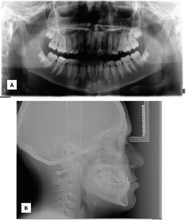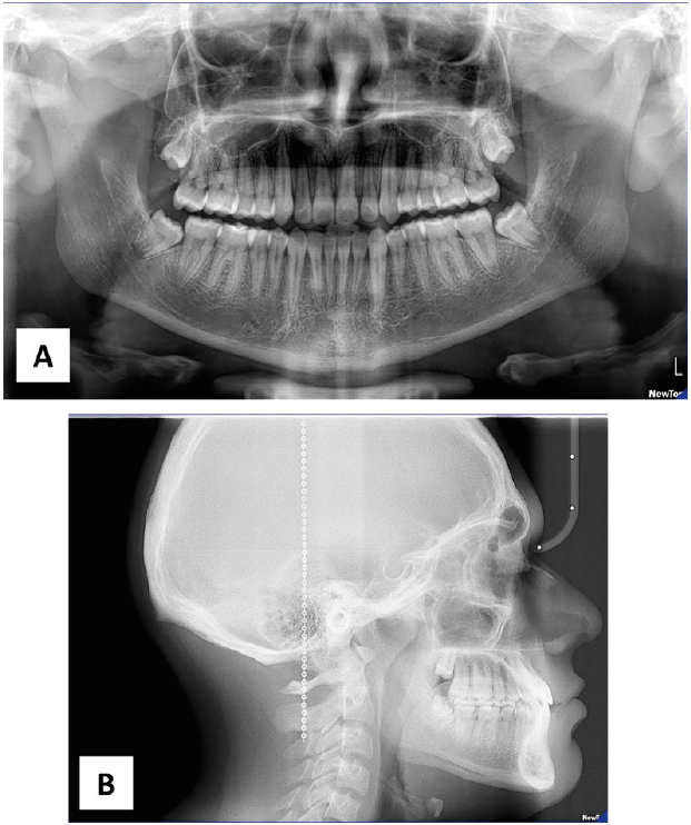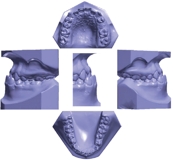 Paciente masculino de 12 años que asistió a la clínica de ortodoncia de la DEPeI de la Facultad de Odontología UNAM, donde tenemos sus registros fotográficos (Figura 1), radiológicos (Figura 2) y digitales (Figura 3). El diagnóstico facial consistió en un perfil cóncavo, proquelia inferior y biotipo euriprosopo. Cefalométricamente el paciente presentó Clase III esquelética combinada por retrusión y prognatismo, con un tipo de crecimiento horizontal (Figura 2.B). Dentalmente, clase III molar y canina bilateral y mordida cruzada anterior.