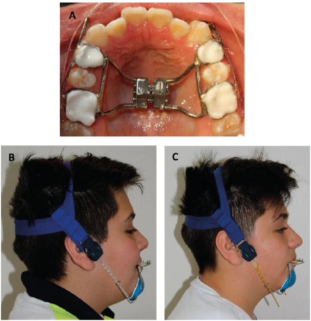 Figura 4 Fase ortopédica. A. Colocación de Hyrax cementado con bandas. B. Fotografía extraoral lateral con la colocación de máscara facial reversa. C. Fotografía extraoral lateral de avance, 10 meses de uso de la máscara facial reversa.