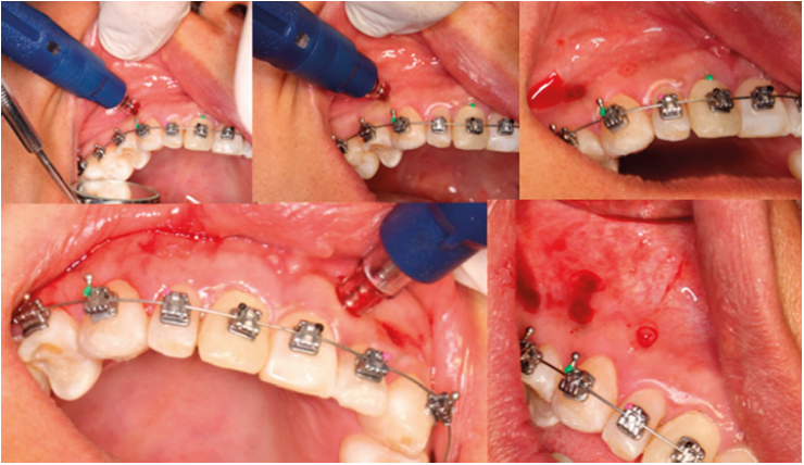 Alikhani et al.15,16, demostraron que, al realizar pequeñas perforaciones en el hueso cortical, aumenta significativamente la tasa de remodelado óseo y de movimiento dentario, ya que se potencializa la respuesta inflamatoria y la expresión de citoquinas en los tejidos periodontales17,18. Teixeira et al19, utilizaron un dispositivo diseñado para realizar las micro-osteoperforaciones, y se reportó una aceleración en la tasa de movimiento dentario en el tratamiento de ortodoncia20.