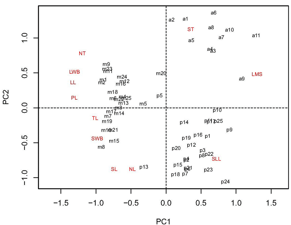 Figure 4 Ordination plot of the Principal Component Analysis (PCA) of the 61 agave plants belonging to the 3 traditional landraces (m: “Manso”, a: “Amarillo”, p: “Prieto”), with regard to the 11 morphometric variables showing the greatest variation: SWB = spine width at the base, LWB = leaf width at the base, SL= spine length, LL = leaf length, NL = number of leaves; NT = number of teeth; PL = plant total length; TL = tooth length; SLL = leaf shape; ST = tooth shape; LMS = leaf margin shape.