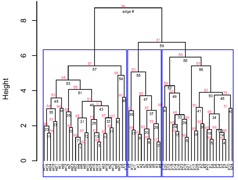 Figure 5 Tree of morphological distances of the plants analyzed (r = 0.82). The clustering method used was the farthest neighbor approach. Values under each node correspond to the group; figures in red indicate the value that supports the group. Abbreviations: m = “Manso”, a = “Amarillo”, p = “Prieto”.