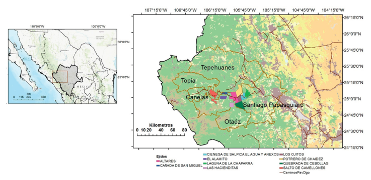 El área de estudio tiene una superficie total de 120,000 ha, en las cuales se identificaron los siguientes ejidos: Los Ojitos, Salpica el Agua, Laguna de la Chaparra, Potrero de Chaidez, Los Altares, Quebrada de Cebollas, El Negro, Las Hacienditas y Salto de Camellones, municipios de Santiago Papasquiaro y Otáez, Durango (Fig. 1). El área está cubierta por bosques de pino, encino y una combinación de ambos con otras latifoliadas (González-Elizondo et al., 2012). El clima de la región es templado, subhúmedo, con lluvias moderadas en el verano y parte de diciembre. La precipitación anual varía entre 850 y 1,450 mm, con un promedio ponderado de 910 mm y una temperatura promedio anual de 13.3 °C (Silva-Flores et al., 2014). El terreno es accidentado con elevaciones entre 1,500 y 3,000 m snm y pendientes entre 10 y 60%. En su gran mayoría, los bosques son tratados con el método de selección usando diferentes intensidades de corta que varían entre 20 y 40% del área basal.