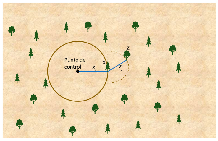 El procedimiento consiste en ubicar el punto central que fue identificado dentro de cada sitio experimental y medir la distancia al individuo (regeneración) más cercano (X) (Cruz-García et al., 2019). Después, se mide la distancia al siguiente individuo más cercano (Z) (Fig. 2).