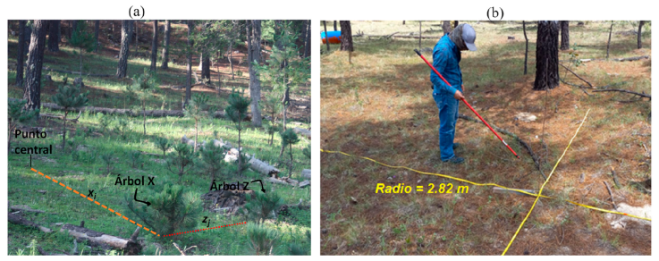 Figura 3 Delimitación de los sitios de muestreo para evaluar la regeneración natural de bosques templados en el noroeste de Durango. a, Delimitación con el método de T2; b, delimitación con un círculo de 25 m2.