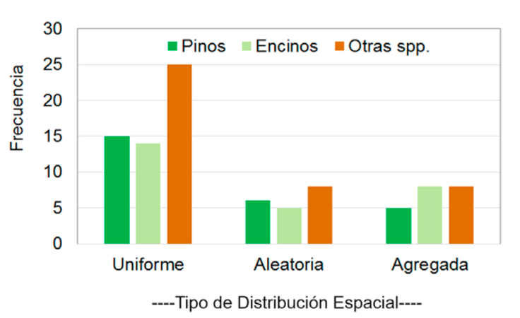 Moreno-González et al. (2007) estudiaron el establecimiento de la regeneración natural a través del método modificado de “parcela 0” en bosques de Jalisco. Ellos encontraron que la distribución espacial del renuevo sigue mayoritariamente un patrón de agregación (68%), seguido de aleatorio (11%) y uniforme (2%). A diferencia de ellos, en este estudio se encontró que el tipo de distribución espacial más común fue uniforme (57%), seguido de agregado (22%) y aleatorio (20%). Estas diferencias pueden deberse al tipo de tratamiento que se aplicó; Moreno-González et al. (2007), evaluaron el tratamiento de árboles padre, mientras que en este estudio fue el de selección individual. En el primer caso, la regeneración tiende a agruparse alrededor de los árboles semilleros y, por lo general, los claros son más grandes. Mientras que en el tratamiento de selección, los claros son más pequeños y la semilla proviene de los árboles que están en el borde del claro, generando una distribución más uniforme.