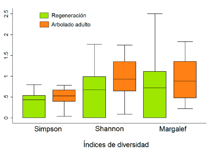 Se estimaron índices de diversidad para evaluar cambios en la composición de especies, particularmente los índices de Shannon, Margalef, Simpson y valor de importancia para el estrato adulto y la regeneración. La Figura 5 indica que no existen diferencias significativas en los 3 índices al comparar la diversidad del arbolado y la de regeneración natural.