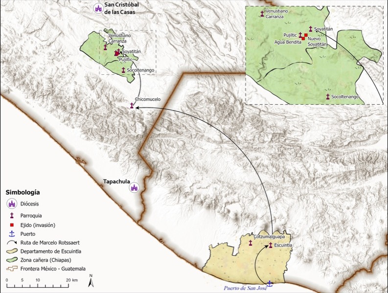 En este sentido, este texto busca conectar la historia de un sacerdote belga exiliado en Chiapas, Marcelo Rotssaert, con procesos transnacionales -la guerra civil y la teología de la liberación-, regionales -la lucha campesina y el trabajo pastoral en la Costa Sur de Guatemala- y locales -el refugio y la lucha agraria en Chiapas-. Particularmente, mediante una especie de historia de vida, nos interesa trazar la trayectoria del padre Marcelo en Chiapas entre 1983 y 1990, periodo que abarca su llegada a México, su permanencia en la parroquia de Soyatitán y su expulsión del país.