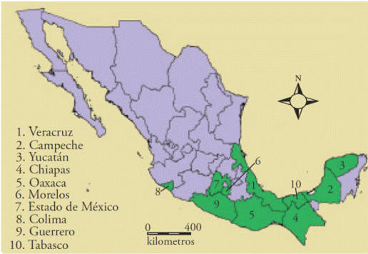 This study was developed in the humid and subhumid tropical area of México, which includes climate group A, based on García (1981), which corresponds to warm climates (Aw0, Aw1, Aw2, Am and Af), and covers mainly the coastal region of the Gulf of México and the Pacific Ocean. This region corresponds to the area of influence where the H-520 maize hybrid was generated, evaluated, promoted, where the basic and certified seed is produced, and where the companies or seed groups that currently produce and distribute the H-520 certified seed are located.