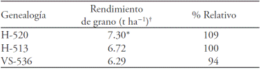 Once the H-520 maize hybrid was defined as outstanding, validation plots were established in 14 environments in Veracruz and Tabasco during the years 1999 to 2010, in order to understand their behavior at the commercial or semi-commercial level, under the traditional knowledge of producers. In this phase of validation, the H-520 had an average grain yield of 7.07 t ha-1, 8 % higher in comparison to the H-513, the hybrid with highest yields in those years and 36 % more than the synthetic variety VS- 536, of greatest commercial use in the southeast of México (Table 2).