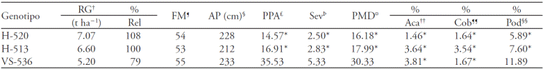 †Average grain yield in 14 environments in Veracruz and Tabasco; ’days until male flowering; §plant height; ₤percentage of plants with “dwarfing”; Þseverity of damage from “dwarfing” in plant; ¤percentage of corncobs with damage from “dwarf” disease; ††percentage of lodged plants; ’’percentage of cobs with bad coverage; §§percentage of rotten cobs.