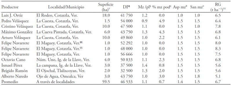 From a sample of 10 producers and 12 maize plots that sowed the H-520 hybrid during the Spring-Summer cycle of 2009, using certified seed from the groups, “Productores de grano del Sotavento”, Consorcio Agropecuario Velásquez”, “Semillas Terra” and “Semillas La Ejidal”, in the municipalities of Cotaxtla, Ignacio de la Llave and Omealca, Veracruz, on a surface of 59.5 hectares, an average density of 46_533 plants ha-1, and a mean yield of 6.71 t ha-1, was found, and a low average percentage of rotten cobs (0.71 %) was recorded, with good aspect and health of the cob. The yields obtained in commercial sowing with certified seed produced locally by producers’ groups, show the real yield potential; also, the H-520 hybrid adapts to the weather, soil and management conditions by farmers in the Mexican Tropics, but specifically the actual feasibility of the use of good quality seed (Sierra Macías et al., 2005; Sierra Macías et al., 2008; Espinosa Calderón et al., 1998) (Table 5).
