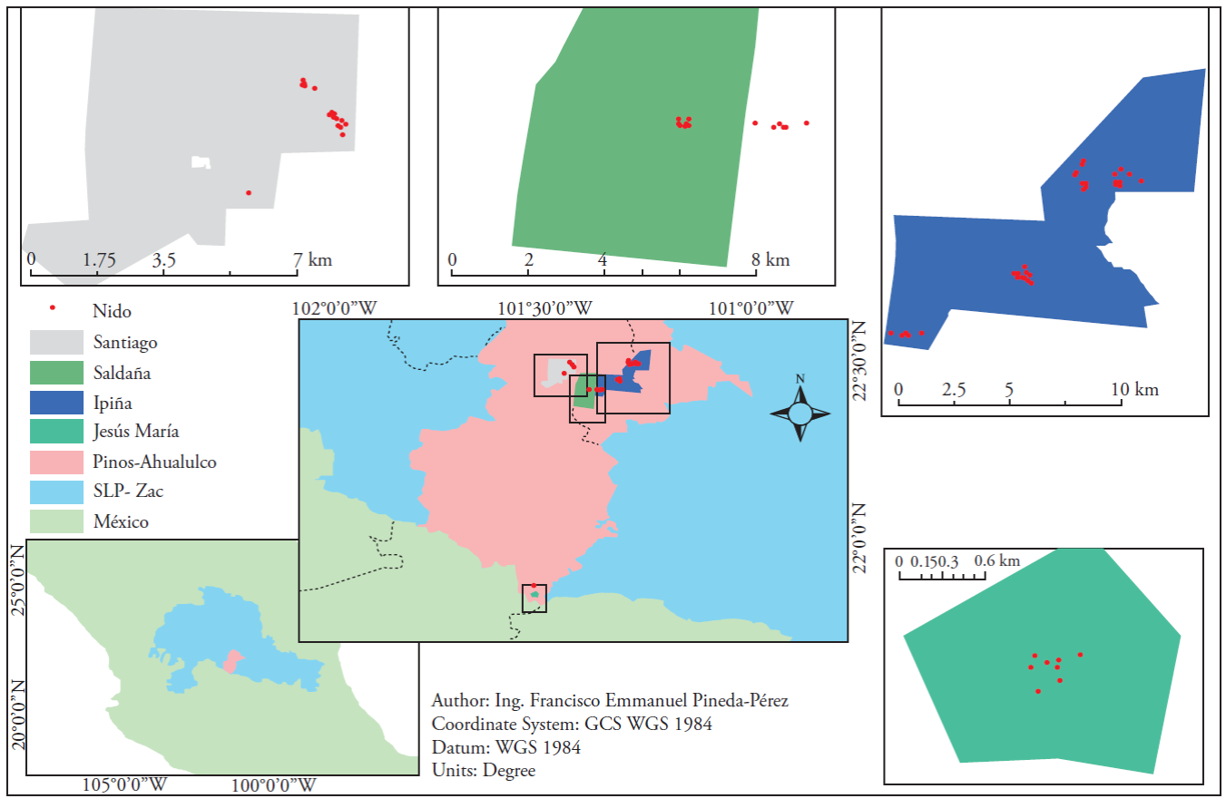 Seventy-seven (77) nests were found and evaluated in four localities of the Potosino-Zacatecano High Plateau. Of these, 61 presented a disturbed condition and 16 a conserved condition.