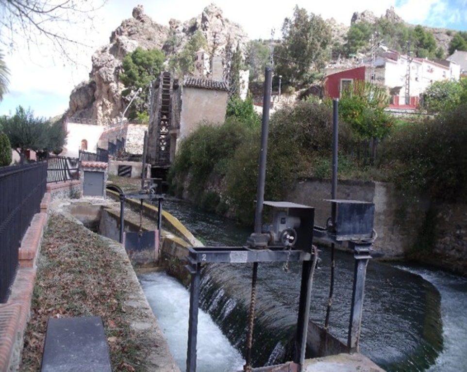 Con objeto de no reponer el azud que la acequia de Blanca tenía en Las Canales, destruido en 1805 por una avenida catastrófica que se llevó varios azudes, en 1807 se llega a un acuerdo entre los heredamientos de las acequias de Abarán y Blanca, para utilizar de forma conjunta el azud del Menjú. Se contrata a Francisco Lician (maestro en obras hidráulicas) para ampliar las minas del Peñasco y facilitar el paso de un mayor volumen de agua en ese tramo de acequia entre el Menjú y Las Canales. Se establece un partidor de aguas para las dos acequias a la salida de las minas. También, diseña una rueda de corriente baja elevadora de agua, La Noria Grande, que comienza a funcionar en 1807 (Figura 6). En el paraje de Las Canales, se desarrollaría también el complejo industrial del Molino de Papel (molino papelero, batán y serrería industrial), al utilizar el agua como fuente de energía (Gómez, 1991).