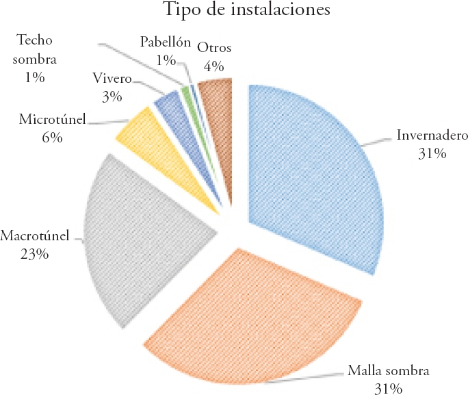 En el censo realizado por el INEGI Agropecuario 2022, se menciona que un sistema de producción que ha presentado un crecimiento en el país, es la agricultura protegida (AP); la utilización de la tecnología y la infraestructura, han ayudado a subsanar factores ambientales y llevar un control efectivo para la protección de las plantas que les ayudan a evitar plagas o enfermedades, lo que permite mejorar el rendimiento de los cultivos. En México, hay 30,179 unidades de producción que practican la AP, abarcando una superficie de 77,417 héctareas; por ejemplo, en el Estado de México, que se ubicaron 35 de cada 100 unidades de producción (INEGI, 2022). En la Figura 1, se muestra el tipo de instalaciones que se ocupan en la agricultura protegida, de acuerdo a su superficie.