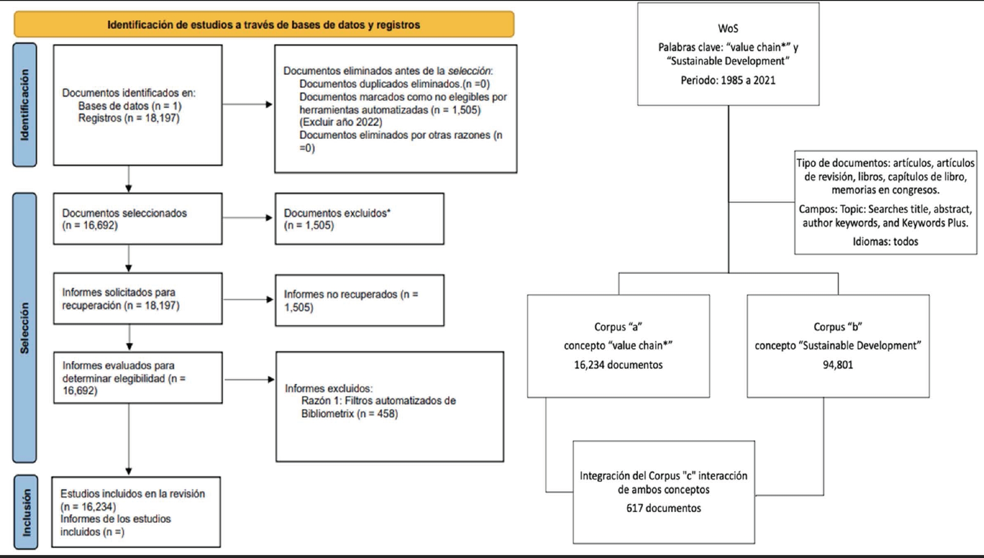 La revisión se realizó siguiendo el protocolo PRISMA (Page et al., 2021), que asegura la transparencia y el registro adecuado del proceso. La búsqueda de literatura, se realizó utilizando las palabras “desarrollo sostenible” y “cadena de valor” combinadas con el operador “AND”. Se incluyeron publicaciones académicas en inglés registradas entre 1985 y 2021. Los estudios elegidos, se descargaron en formato de texto plano con la opción de registro completo. La estrategia de búsqueda, selección y elegibilidad de los estudios, se detalla en el diagrama de flujo PRISMA para el corpus “cadena de valor” (Figura 1).