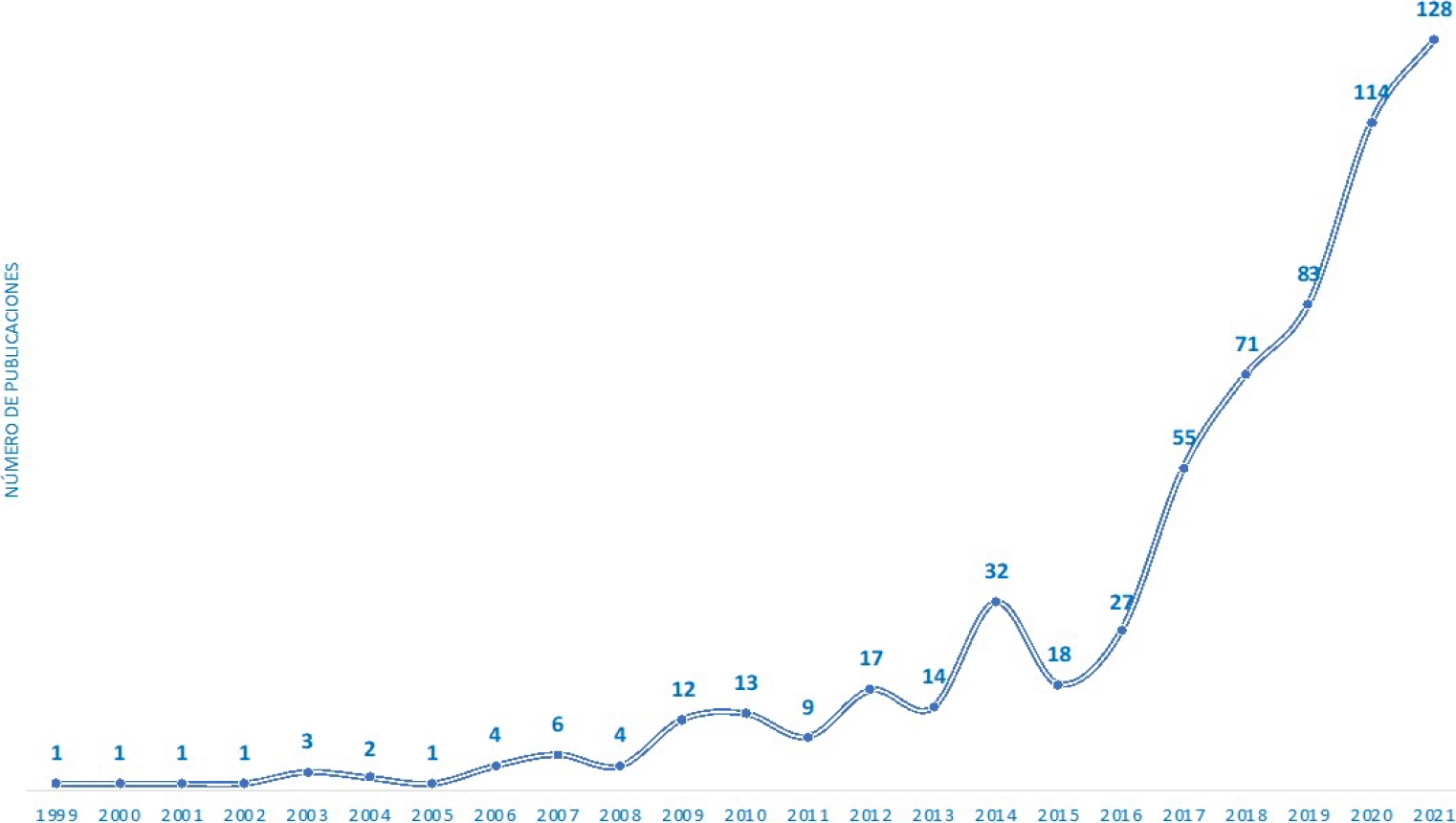 La variación numérica de las publicaciones del corpus “Convergencia”, mostró un crecimiento exponencial en el periodo analizado (Figura 2). Entre 1999 y 2021, se observó una tasa de crecimiento anual promedio de 45% en el número de publicaciones, lo que evidencia el interés creciente en este campo de estudio y lo sitúa como uno de los de mayor crecimiento en la investigación científica. Este crecimiento, adquirió un impulso notable en el período más reciente. En los últimos siete años (2015-2021), se publicaron en promedio, 10 veces más artículos por año (promedio de 70.8 artículos por año) que en el periodo anterior (1999-2014) (promedio de 7.5 artículos por año), revelando un campo emergente en continua expansión y desarrollo.