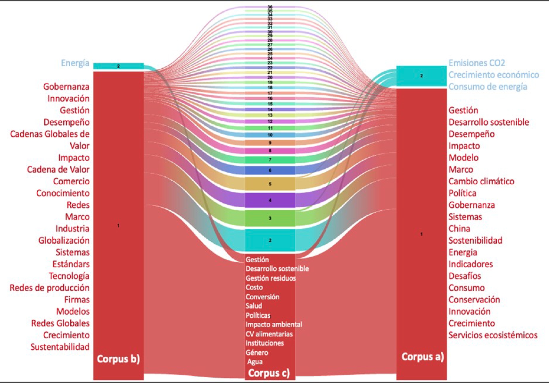 Mediante un algoritmo de detección de comunidades, se identificaron 36 bloques temáticos para el corpus “Convergencia”. Los bloques en cada columna del diagrama aluvial, representan clústeres temáticos, y la altura del bloque, indica el volumen o tamaño del campo de investigación. El bloque 1, que se destacó como uno de los más relevantes, presentó publicaciones sobre diversos temas interrelacionados: gestión sostenible en sistemas alimentarios, participación corporativa en los Objetivos de Desarrollo Sostenible (ODS), impacto de tecnologías emergentes en estrategias comerciales, Industria 4.0, economía circular y gestión de problemas sociales en cadenas productivas (Goyal et al., 2018; Nagy et al., 2018; Van Zanten y Van Tulder, 2018; Yawar y Seuring, 2017). El resto de los bloques, representan la diversidad de temáticas emergentes, reflejando la naturaleza multidisciplinaria y compleja del dominio “Convergencia”. Estos bloques, muestran cómo diversos aspectos de la tecnología, la sociedad, la economía y el ambiente, están interconectados en la investigación científica contemporánea.