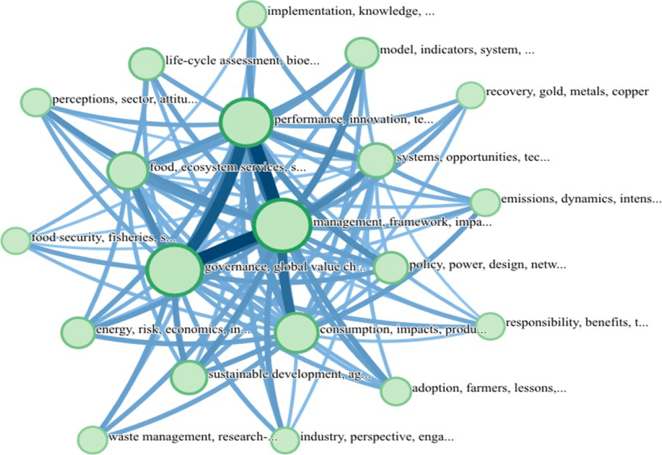 En este contexto, en el presente estudio, se realiza un análisis de redes de co-ocurrencias de palabras clave y su evolución temporal, lo que permite caracterizar las principales áreas de investigación y las tendencias emergentes en este campo. Al examinar distintos subperíodos, se identifican cambios en las temáticas más relevantes y la aparición de nuevos conceptos clave. Esta exploración, proporciona una visión general de la evolución de estos campos de estudio e identifica áreas de intersección entre ellos. Se espera que los resultados de esta investigación, guíen futuras investigaciones hacia nuevas líneas de estudio, sobre la convergencia entre el DS y las CV, contribuyendo así, al desarrollo de modelos de producción más sostenibles y a la innovación en la gestión de ambos conceptos.