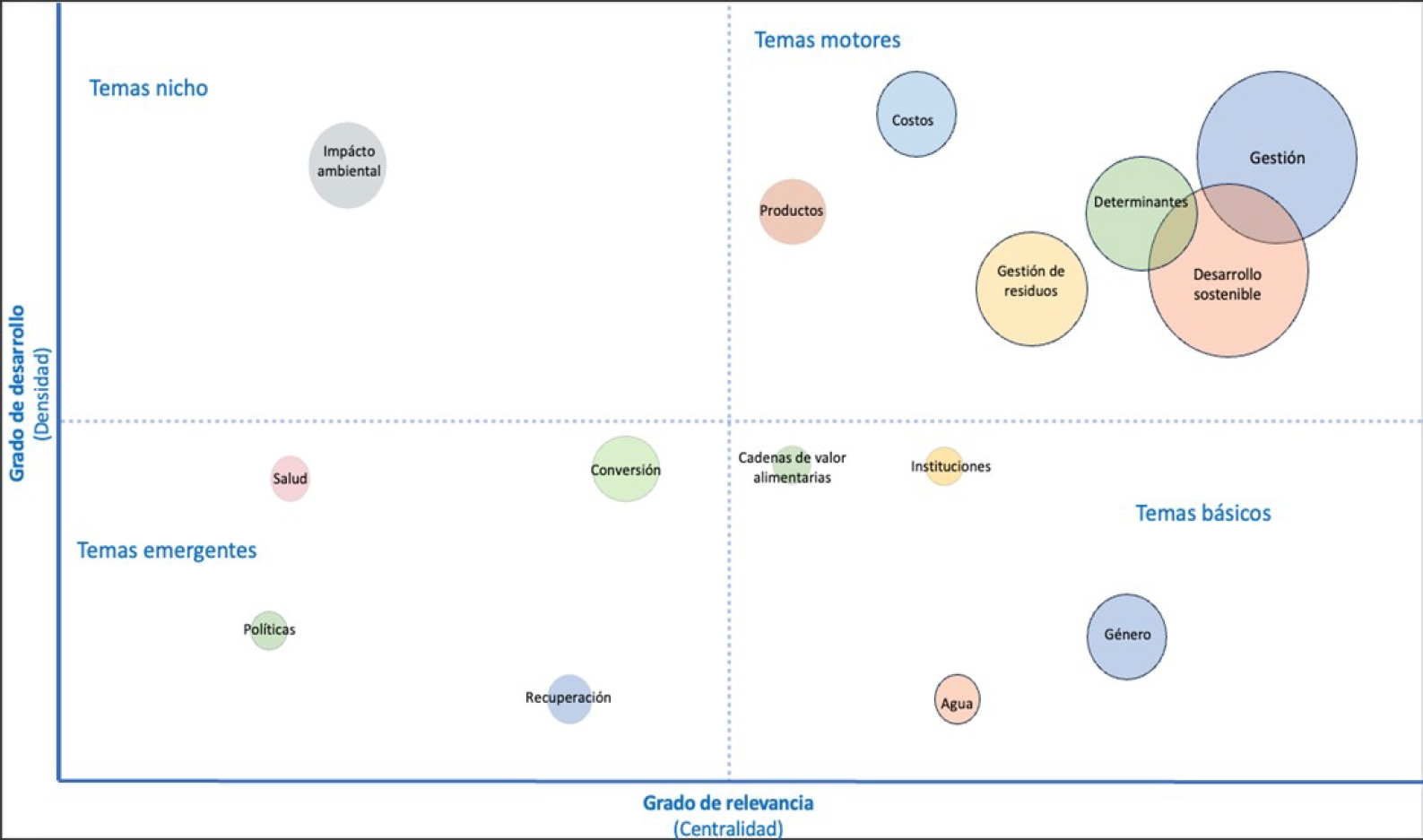 Posteriormente, se evaluó la estructura conceptual de las publicaciones mediante Bibliometrix (Aria y Cuccurullo, 2017), una herramienta basada en R, que permite la creación de mapas temáticos y el análisis de la evolución temática a lo largo del tiempo (Aria et al., 2020). Los mapas temáticos resultantes, visualizaron los patrones estructurales y cognitivos del dominio, agrupando las temáticas en clústeres basados en valores de centralidad y densidad (Callon et al., 1991). Estos mapas, se dividen en cuatro cuadrantes que representan los diferentes tipos de temáticas: motrices, fundamentales, emergentes y especializadas. Para la construcción de estos mapas, se utilizó el campo “palabras clave plus”, ya que, según Olawumi y Chan (2018), este campo, ayuda a identificar conceptos y contenidos clave de los documentos científicos, además de mostrar el desarrollo del dominio a lo largo del tiempo.