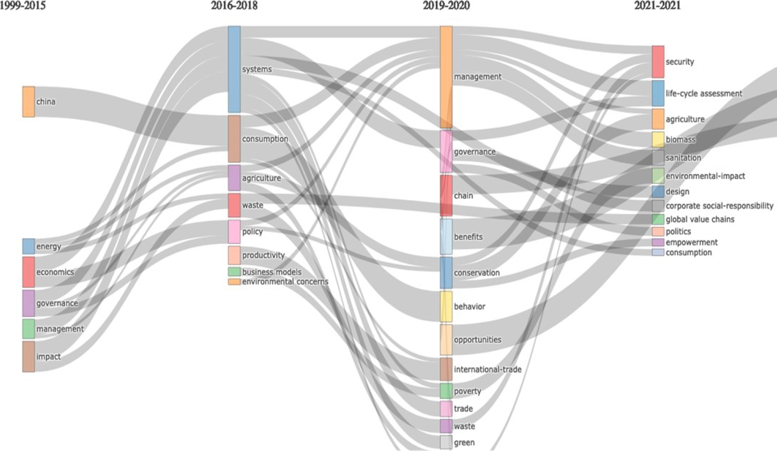 La Figura 6, ilustra mediante un diagrama de Sankey, la evolución temporal. En etapas iniciales (1999-2015), la investigación se centraba en términos amplios como China, energía y economía. En un análisis particular, el concepto de “gestión”, en este periodo, se enfocó en publicaciones sobre innovación y actividades productivas en sectores como el agrícola y ganadero (Bhaskaran et al., 2006; Soosay et al., 2012; Tarawali et al. 2011). Posteriormente, se observa una evolución en temáticas relacionadas con la sostenibilidad, aspectos ambientales y sociales. En el período 2016-2018, “gestión” se asoció con nuevos términos como “marco” y “gobernanza”, enfocados en problemáticas sociales, desempeño ambiental y social e innovación en cadenas de suministro (Arnold 2017; Jelsma et al. 2017; Yawar y Seuring 2017). En 2021, las temáticas, tuvieron un énfasis en temas como la responsabilidad social corporativa y el impacto ambiental. El seguimiento particular del concepto “gestión”, se relacionó con barreras e impulsores para el DS, la relación de diversas actividades con los ODS y la diversificación tecnológica (Baffoe et al. 2021; Cheng et al., 2021; Sidibé et al. 2021).