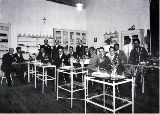 Figura 1 Laboratorio de Estudios Médicos y Biológicos, ca. 1941. Entre otros científicos españoles y mexicanos figuran: Tomán G. Perrín, José J. Izquierdo, Gonzalo R. Lafora (quinto por la izquierda), Rosendo Carrasco, Sixto Obrador, Jaime Pi-Suñer e Ignacio González Guzmán. Fuente: archivo privado.
