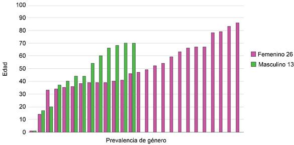 En la Figura 1 encontramos la distribución por sexo y edad, 26 correspondieron a pacientes femeninos (66.6%) y 13 correspondieron a pacientes masculinos, la edad varió de menos de un año hasta 88 años, el promedio de edad para las mujeres fue de 46 años, el promedio de edad para los hombres fue 49 años.