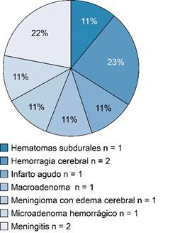 Clasificamos a los incidentalomas en tres categorías: categoría I: los que no ponen en riesgo la vida del paciente, no es necesariamente reportable, en nuestra estadística con 23 casos (59%). Categoría II: reportable para continuar su estudio en forma rutinaria, no urgente, con nueve casos (23%). Categoría III: atención de urgencia, con siete casos (18%). Los siete casos fueron los siguientes: meningitis; microadenoma, con cambios hemorrágicos; meningitis y meningoencefalitis; meningioma parietal izquierdo con edema cerebral; infarto hiperagudo; hematomas subdurales y hemorragia intraventricular.