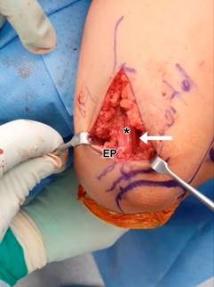 Figura 3: Transoperatorio codo derecho: nervio cubital estabilizado en túnel cubital codo derecho. Sin dislocación de vasto medial del tríceps (flecha), posterior a la transposición.