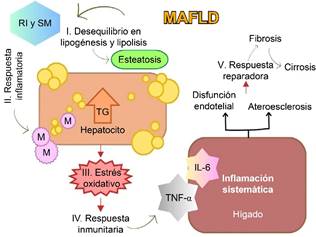 Fisiopatología (Figura 1). La MAFLD comienza por un desequilibrio en la síntesis y eliminación de lípidos en el hígado (lipogénesis y lipólisis), lo que origina una esteatosis a nivel celular, pues se incrementa también la cantidad de triglicéridos dentro de los hepatocitos. Ante esta situación, se desencadena una respuesta inflamatoria, atrayendo células al hígado como los macrófagos, que a su vez liberan sustancias proinflamatorias y generan un estrés oxidativo dentro de las células hepáticas. Posteriormente, se activa una respuesta inmunitaria ante la incapacidad de esta desintoxicación, que resulta agresiva porque se liberan citocinas inflamatorias, siendo el factor de necrosis tumoral alfa (TNF-α) y la interleucina 6 (IL-6) las más importantes, pues afectan la función hepática y conduce a inflamación sistémica, misma que contribuirá a una disfunción endotelial y a la ateroesclerosis.6,7