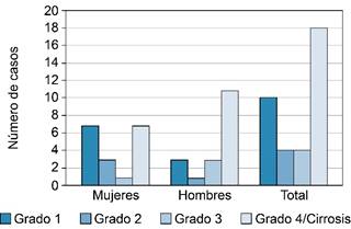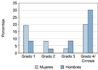 Más de la mitad de los pacientes presentaron algún grado de fibrosis, siendo más prevalente el grado 4 o cirrosis, de la cual hubo mayor prevalencia del patrón mixto. Algunos estudios epidemiológicos sugieren que hay variaciones de género entre las diferentes clasificaciones de gravedad, con una presentación de la enfermedad más avanzada y un curso más agresivo en mujeres que en hombres;18 sin embargo, en el presente estudio se encontró lo opuesto, ya que hubo mayor prevalencia de fibrosis grado 3 y cirrosis en hombres (Figura 3).