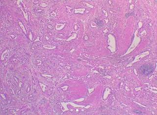 Figura 1: Adenocarcinoma gástrico invasor, moderadamente diferenciado (grado histológico 2) o clasificación de Lauren (adenocarcinoma de tipo intestinal) o bien clasificación OMS 2019 (subtipo tubular). Localización del tumor: pared anterior y posterior del antro y píloro.