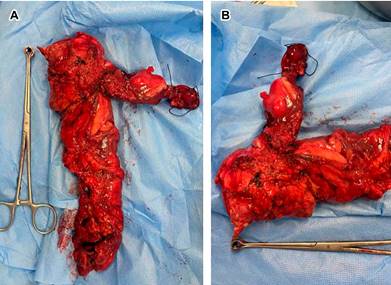 Figura 2: A) Producto de resección de segmento de recto e histerectomía total con salpingooforectomía izquierda. B) Recto con infiltración transmural y extensión a pared de cérvix posterior, localización a 5 cm del margen quirúrgico distal.