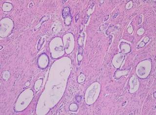 Mujer de 61 años, con antecedente de gastrectomía distal por tumor exofítico en el antro y píloro con reporte histopatológico (Figura 1), adenocarcinoma gástrico invasor, con gastroyeyunostomía en Y de Roux, quimioterapia y radiación casi tres años antes de su presentación aguda. Inicia con malestar general, pérdida de peso y anemia grado III (OMS). Con tomografía computarizada que mostró engrosamiento de la pared rectal con involucro a útero. La colonoscopia reporta zona de induración a 5 cm del margen anal, por lo que se realiza resección del segmento de recto e histerectomía total (Figura 2) con reporte de adenocarcinoma moderadamente diferenciado compatible morfológicamente con primario gástrico (Figura 3), la paciente tuvo adecuada recuperación clínica, con tratamiento quimoterapéutico adyuvante.
