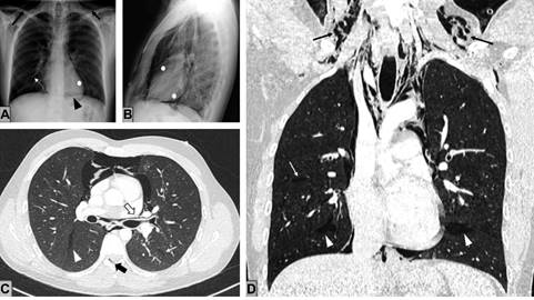Figura 1: A) Radiografía de tórax posteroanterior. B) Lateral que muestra una radiolucencia lineal que dibuja el contorno mediastínico y cardiaco (asteriscos blancos), con el signo del diafragma continuo (punta de flecha negra), compatible con neumomediastino. Asocia focos de enfisema intersticial (flecha blanca) y enfisema subcutáneo cervical (flechas negras). C) Cortes axiales. D) Coronales de tomografía computarizada torácica sin contraste intravenoso que reflejan focos de enfisema intersticial y bandas aéreas lineales que disecan las vainas broncovasculares desde los bronquios distales hacia los hilios pulmonares (flecha hueca negra). El aire se extiende a mediastino, cisuras pleurales (puntas de flecha blancas), canal epidural (flecha gruesa negra) y planos musculares y tejido celular subcutáneo cervical. No hay defectos murales traqueobronquiales ni esofágicos.