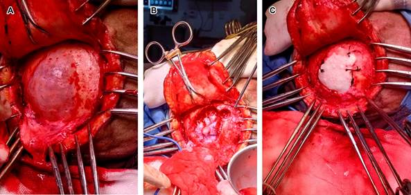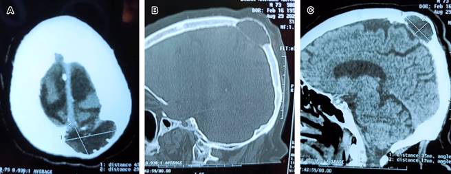 Figura 1: Imágenes tomográficas de cráneo. A) Corte axial superficial que muestra quiste leptomeníngeo de 8 cm de diámetro por 4 cm de profundidad. B y C) Cortes sagitales, se observa adelgazamiento de ambas Tablas óseas, siendo más importante el estrechamiento de la Tabla interna, con comunicación de leptomeninges al diploe.