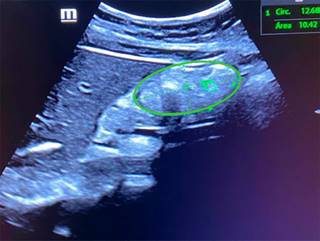 Previo al procedimiento endoscópico, se colocó al paciente en decúbito lateral derecho y se aplicó gel en la región epigástrica, se encendió el equipo de ultrasonido Butterfly iQ/iQ+™ y se seleccionó la configuración predeterminada vista de abdomen, se coloca la sonda universal del mismo equipo de ultrasonido sagitalmente en la región epigástrica, se realizó un barrido en dicha región, inicialmente girando en sentido de las manecillas del reloj y después en contra de ellas, también desplazándose en sentido cefálico y caudal con la finalidad de obtener la vista más adecuada de la región transversal del antro gástrico para realizar una medición de su área transversal abarcando todo el espesor de la pared gástrica (Figura 1), posteriormente de acuerdo a la fórmula de Perlas12 (27.0 + (14.6 × (área transversal del antro gástrico en centímetros)) − (1.28 × edad)) se obtuvo el volumen de contenido gástrico. Este procedimiento fue replicado por dos únicos residentes del servicio de anestesiología, a continuación, se realizó procedimiento endoscópico como previamente había sido planeado por el servicio de gastroenterología aspirando el contenido gástrico total para ser medido. Ambos residentes de anestesiología fueron cegados entre sus mediciones obtenidas y el contenido aspirado por endoscopia, siendo recolectados los datos por un cuarto integrante del grupo de investigación. Para el análisis de datos se utilizó el software Stata versión 14 (StataCorp LLC software, Texas, EE. UU.). Las variables continuas y categóricas se expresaron como medidas de tendencia central. Se obtuvo el índice de κ ponderado para ver el nivel de concordancia entre los resultados medidos entre los usuarios de ultrasonido. Posteriormente se realizó un promedio de los volúmenes obtenidos por ultrasonido entre ambos usuarios, y se obtuvo la correlación por coeficiente de Pearson entre lo medido por ultrasonido promedio y lo aspirado por endoscopia, así como lo medido por ultrasonido promedio y las horas de ayuno, y por último la medición de contenido gástrico y las horas de ayuno. El criterio de significación estadística fue p < 0.05.