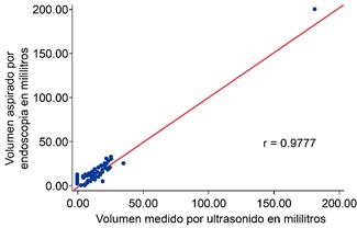 Figura 2: Correlación entre volumen promedio de contenido gástrico por ultrasonido y el medido por endoscopia.