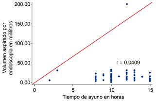 El presente estudio encontró que en 58 pacientes con endoscopia de manera electiva con las horas de ayuno establecidas por la asociación americana de anestesiologos,11 la medición de contenido gástrico tiene un buen rendimiento (alto coeficiente de correlación) al compararse con el estándar de oro que es medirlo al aspirar todo el contenido gástrico bajo examen gastroscópico.14