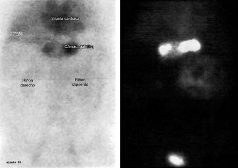 Figura 2: Gammagrafía con eritrocitos marcados con presencia de sangrado en uniones gastroduodenal y duodenoyeyunal.