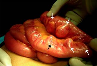 Figura 3: Laparotomía exploradora en donde se observan múltiples divertículos a nivel de yeyuno (flechas).