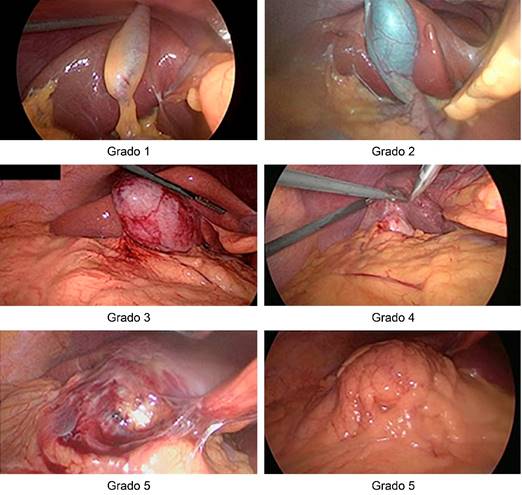 La escala de Parkland (PGS) se trata de un sistema de clasificación intraoperatoria basado en la anatomía, adherencias y los cambios inflamatorios de la vesícula biliar que se observan durante la colecistectomía laparoscópica6 (Figura 1). Ha demostrado ser un predictor superior de la dificultad operatoria, la duración de la cirugía, las tasas de conversión a cirugía abierta y las tasas de complicaciones en comparación con otras escalas de clasificación de la colecistitis.7 Su aplicación durante la colecistectomía laparoscópica ha permitido una estratificación precisa de la inflamación vesicular, lo que contribuye a una mejor planificación quirúrgica y a resultados postoperatorios favorables.8 Por lo que puede existir una relación entre el grado de colecistitis con el grado de inflamación de la PGS que nos ayude a predecir la clínica el evento intraoperatorio.